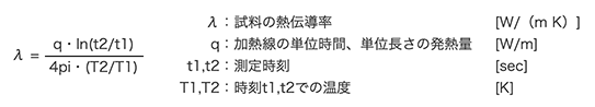 加熱線に一定電流を通じると熱が発生し、加熱線の温度は上昇します。熱伝導率の高い試料(セラミックスなど)では、熱は急速に移動し試料側に逃げてゆくために加熱線の温度は小さくなります。逆に熱伝導率が低い試料(断熱材など)では、熱が逃げ難いために加熱線の温度は大きく上昇します。このように加熱線の温度上昇は試料の熱伝導率に関係し、下記の式で現されます。すなわち、試料の熱伝導率は時間軸を対数目盛りにした昇温グラフの傾きから求めることができます。