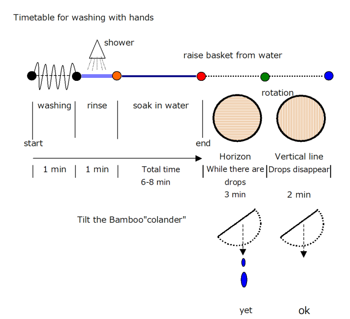 手洗いは、「麹米」を洗う時に用いられる。正確な分、秒を争う洗米作業となる中で洗い終わった米を水に漬け、水から上げて付着水を素早く確実に切る事が要求される。この用途に合う道具が求められてきた。道具は使い方でいかようにも使う人の目的にかなう最善の働きをもたらす。人が手で洗う時に肝心な点は、人が洗い持ち上げる事が可能な米の量と、バランスの良いサイズの竹笊がもたらす快適な水切りにあり、使う「竹笊」は45度に傾けて水を切る。ここで竹笊の仕事を最善にするために最初は、笊の目が水平方向に向けて手で持ち、かつ45度に傾けて静置し素早く水を切り、米に含まれている水がぽたぽたと切れた時点で、更に90度回転させて笊の目を垂直にして笊目に残る余分な水分を全て落とします。