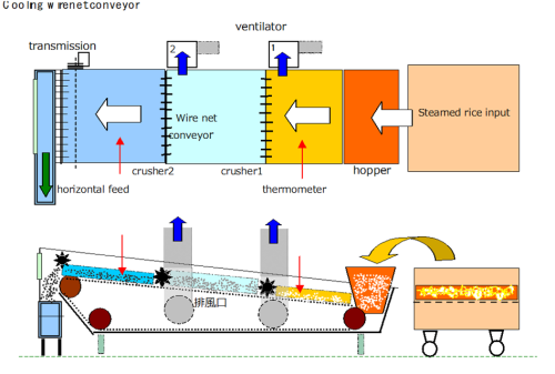 蒸米は右端の甑から投入されネット上を左へ進む、米層は段々薄くなり適温に至る。ネットは、サランネットからステンレス製スパイラルワイヤー、更にヘリンボンタイプへ形状が進化して、欠けた米粒による網の目が詰まる障害が少なくなった。