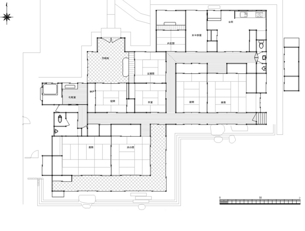 張りも極限まで細い、さらに今となっては、具合が悪い原因の一つは、屋根の構造にある。屋根葺きは京都に集う各種の屋根の様式、入母屋造り、寄せ棟造り、切り妻造り、などを複雑に組み合わせて腕を競わせた結果、近年座敷に雨漏りが目立つようになってきた。屋根が組み合わされる谷と呼ばれる部分が多すぎ、雨の多い夏に漏り始め、戦後の十分でなかった材料事情と、盛り込みすぎた設計が裏目に出てきてしまった。