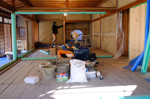 瓦を剥ぐと70年間の重量の掛かり方で柱毎の沈降度合いが異なり、全体の水平を取り直し、各室内を形成する敷居の水平をジャッキで修正し屋根を葺き直す。屋根を変えることは屋根だけでは済まない。3年計画で京都市の補助も半額負担して修復に当たっている。