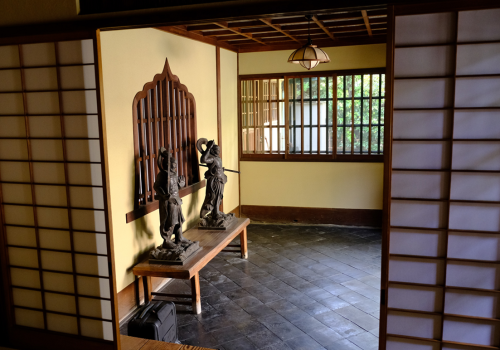 「万暁院」の住居機能は最小限に留めている。表玄関、内玄関、茶室と控えの間、客座敷と次の間、来客用台所からなり来客をもてなす為に伏見にありながら、「洛中の雅」を満喫する工夫に最も重きが置かれている。いわゆる「迎賓館」として活用し、初めて本来の目的にかなう。客間には、冬は「鍋島(なべしま)段通(だんつう)」が敷き詰められ、季節が夏に向かい暖かくなると今では貴重な、「油団(ゆとん)」が敷かれる。内窓は庭の見晴らしを良くする為に柱は細く開くと視野は広い。また閉めた「硝子(がらす)障子(しょうじ)」からの眺めは、一眼レフの「ファインダー」に見える。明るくキラキラと輝きフレームからは、まさに移りゆく四季の趣を醸しだす。