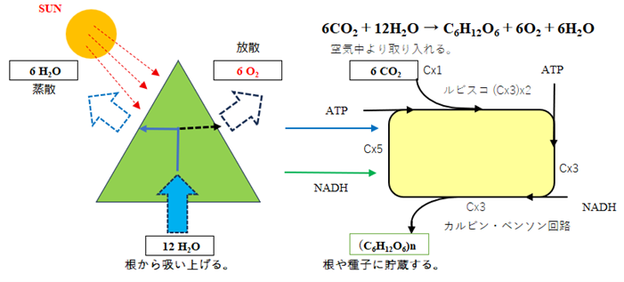 その時作られる「ATP」と「NADH」がカルビン回路へ伝達され、空気中の二酸化炭素と固定され有機物が合成される。