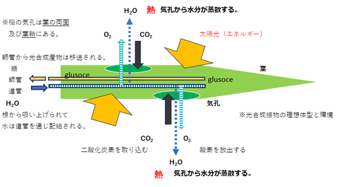 の過程で生じる発熱を蒸発潜熱として利用し稲体の冷却を妨げる境膜の発生を未然に予防している。光合成は日夜安定して