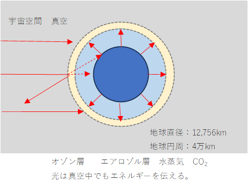 の一部になる。地球のエネルギーの収支は、受ける可視光と出て行く赤外線のバランスで保たれている。
