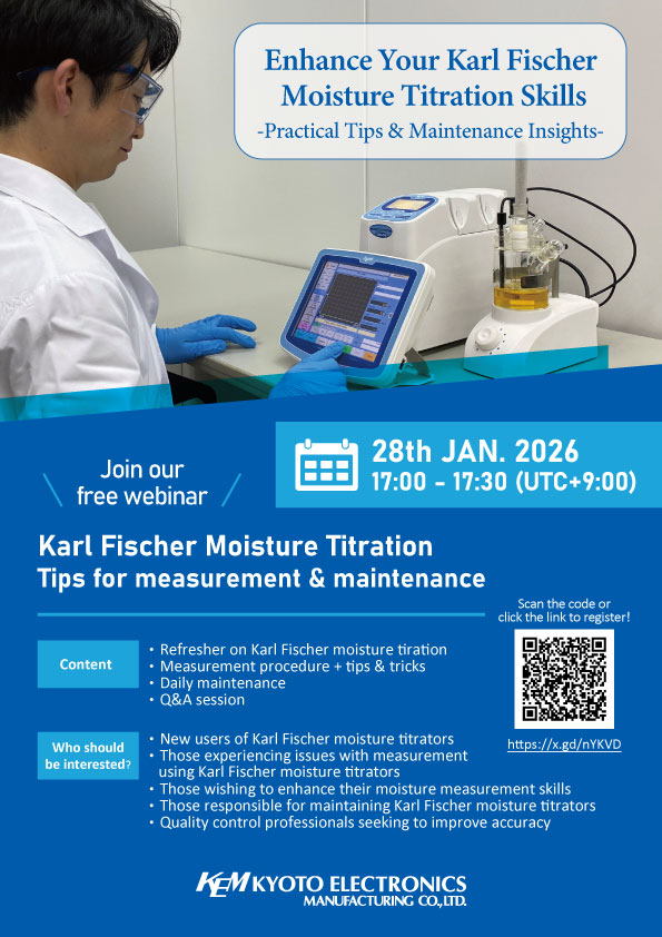 We are pleased to invite you to our upcoming webinar, “Karl Fischer Moisture Titration: Tips for measurement and maintenance.”