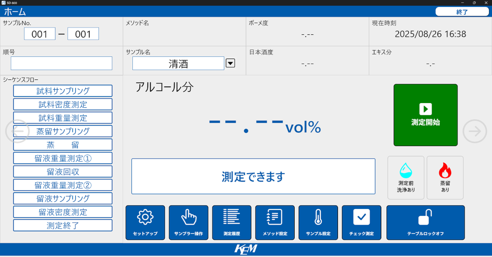 蒸留ありでのアルコール度測定・蒸留なしでの日本酒度・アルコール度測定を簡単に設定可能です。