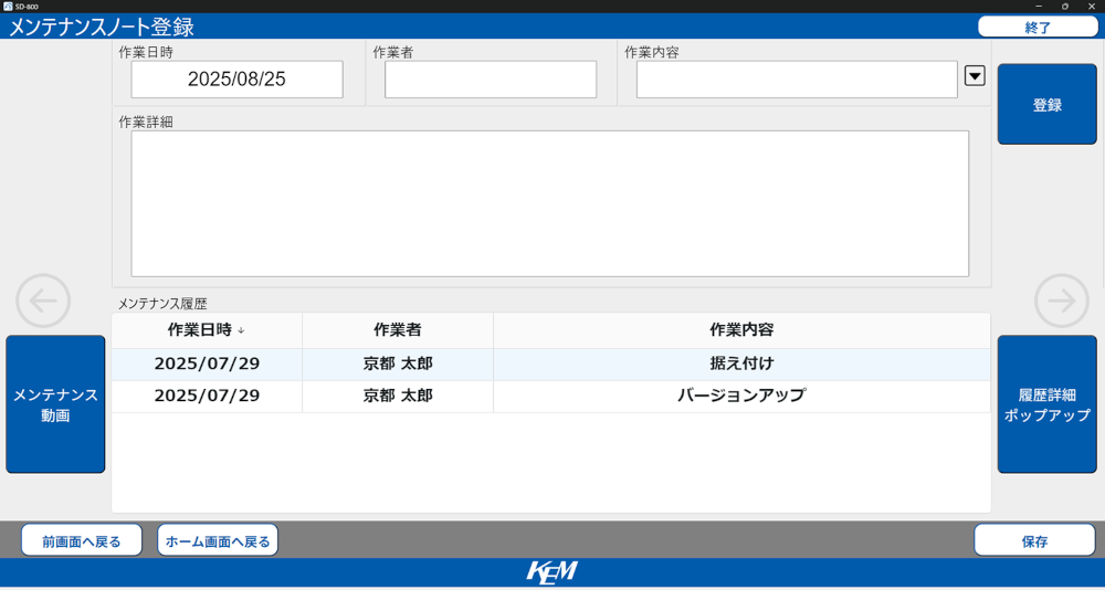 メンテナンスノート採用(装置内にメンテナンス履歴を保存)。