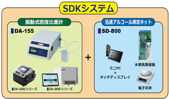 SDK法は、振動式密度計・水蒸気蒸留装置・電子天秤・PC・専用ソフトで構成されており、前処理(水蒸気蒸留装置)により、蒸留酒・醸造酒のエタノール、水とエキス分を分離し、得られた留液(エタノール、水)の密度から、アルコール濃度を算出する方法です。